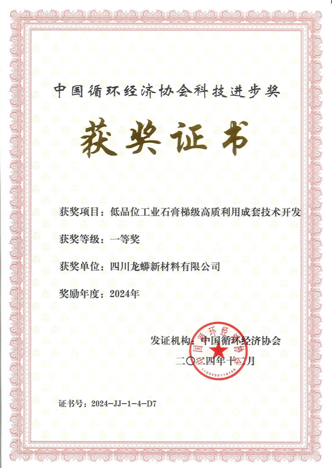 近日,中国循环经济协会在北京市召开2025年全国循环经济科技创新工作会议,会上公布了2024年度科技进步奖评选结果,川发龙蟒与高校联合研发的“低品位工业石膏梯级高质利用成套技术”荣获科技进步奖一等奖。这一荣誉不仅是对公司在固废资源化领域技术实力的认可,也彰显了公司在绿色低碳发展中的行业引领作用。
