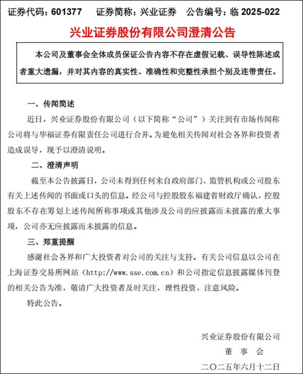 6月12日,兴业证券发布公告称,近日,兴业证券股份有限公司(以下简称“公司”)关注到有市场传闻称公司将与华福证券有限责任公司进行合并。为避免相关传闻对社会各界和投资者造成误导,现予以澄清说明。