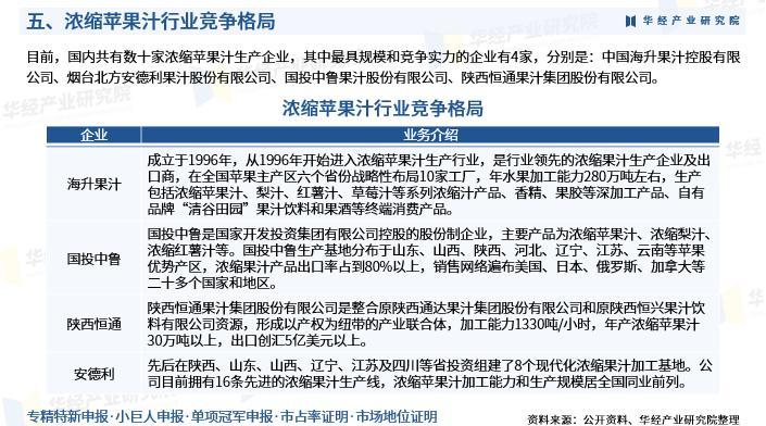 目前,国内共有数十家浓缩苹果汁生产企业,其中最具规模和竞争实力的企业有4家,分别是:中国海升果汁控股有限公司、烟台北方安德利果汁股份有限公司、国投中鲁果汁股份有限公司、陕西恒通果汁集团股份有限公司。
