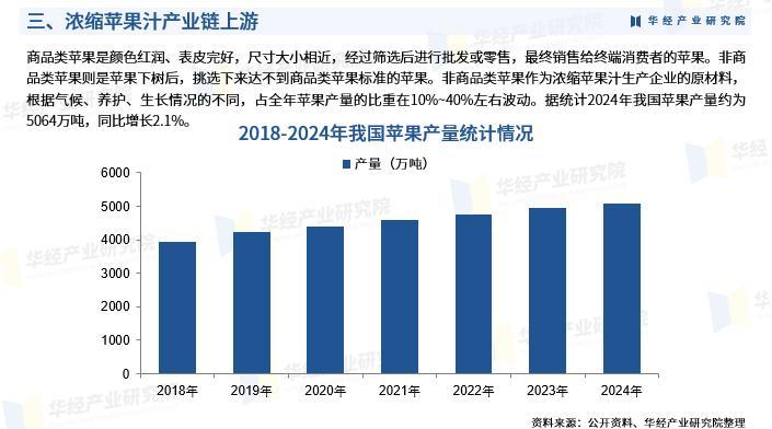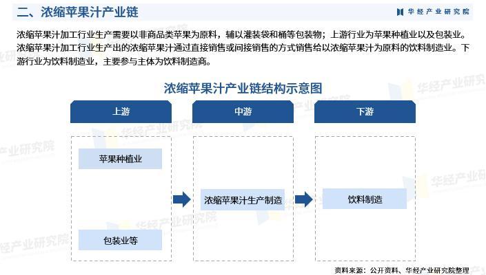浓缩苹果汁加工行业生产需要以非商品类苹果为原料,辅以灌装袋和桶等包装物;上游行业为苹果种植业以及包装业。浓缩苹果汁加工行业生产出的浓缩苹果汁通过直接销售或间接销售的方式销售给以浓缩苹果汁为原料的饮料制造业。下游行业为饮料制造业,主要参与主体为饮料制造商。