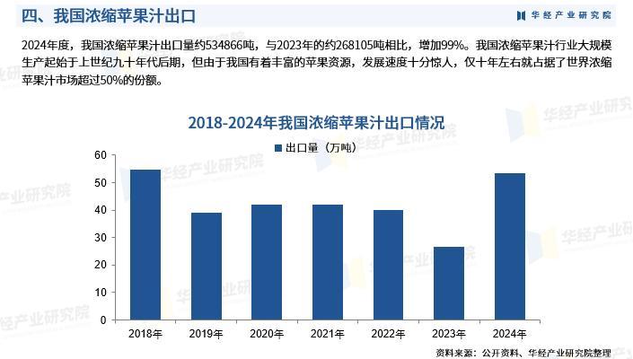 2024年度,我浓缩苹果汁出口量约534866吨,与2023年的约268105吨相比,增加99%。我浓缩苹果汁行业大规模生产起始于上世纪九十年代后期,但由于我国有着丰富的苹果资源,发展速度十分惊人,仅十年左右就占据了世界浓缩苹果汁市场超过50%的份额。