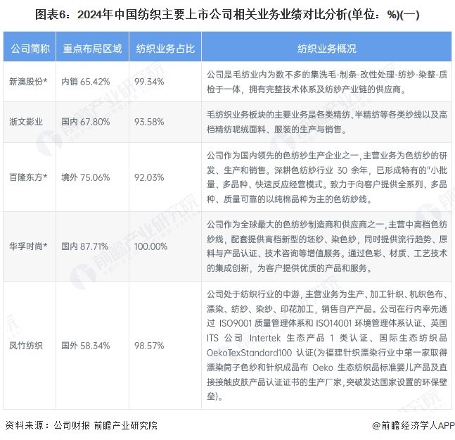 在行业相关上市公司中,从区域布局来看,新澳股份、浙文影业、华孚时尚和金鹰股份等主要布局国内,百隆东方、华升股份、彩蝶实业等主要布局国外。从业务布局来看,新澳股份、浙文影业等为国内领先毛纺织企业,百隆东方、华孚时尚和凤竹纺织等主要布局纱纺领域,金鹰股份和华升股份则主要布局麻纺行业,嘉欣丝绸为内业内领先丝绸企业,彩蝶实业和宏达高科主要从事化学纤维纺织工业。