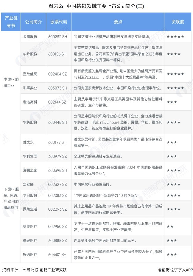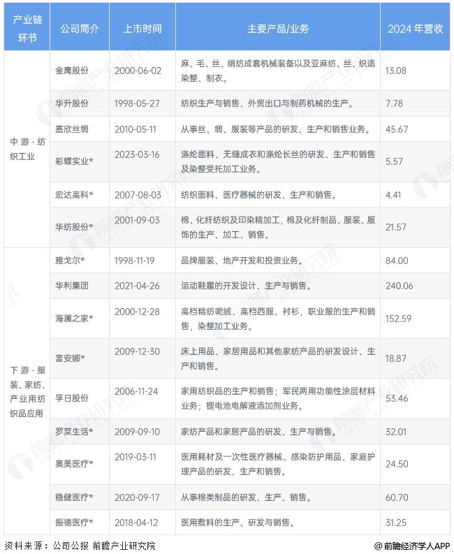 纺织产业链上游原料及配料供应商主要有新赛股份、冠农股份、皇马科技和润土股份等;纺织机械供应商主要有卓郎智能、泰坦股份等;纺织检测主要有华测检测等检测企业。纺织产业链中游企业主要有新奥股份、中鼎纺织、浙文影业、百隆东方、华尚股份等企业。纺织产业链下游服饰服装主要供应商包络雅戈尔、华利集团等;家用纺织品供应商主要包括富安娜、孚日股份等;产业用纺织品主要有奥美医疗、稳健医疗等,产业链上市企业汇总如下: