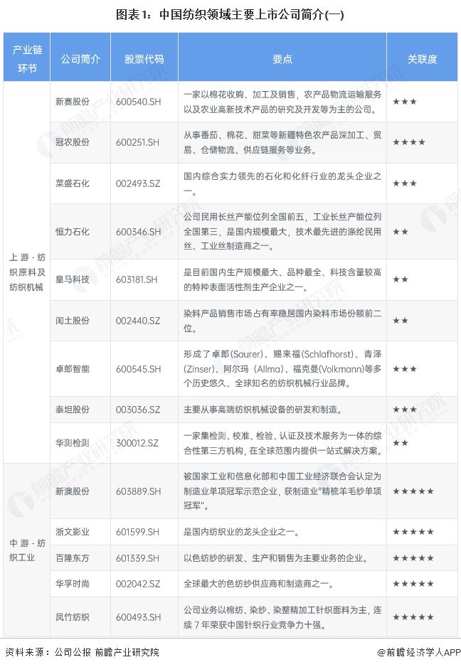 1、纺织行业上市公司汇总及基本信息