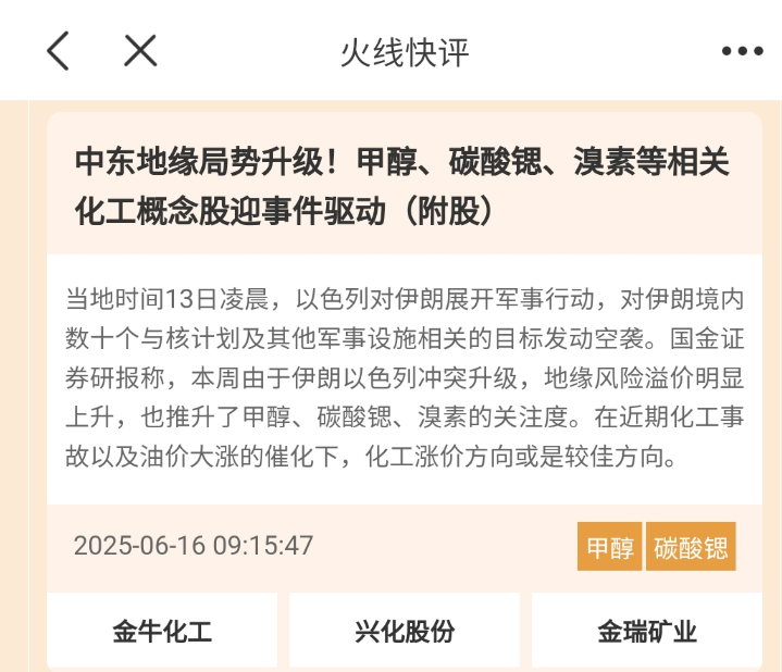 在每日经济新闻App私人订制的“火线快评”中,周一开盘前提到了碳酸锶、甲醇板块,相关个股金牛化工、兴化股份、金瑞矿业本周大涨。