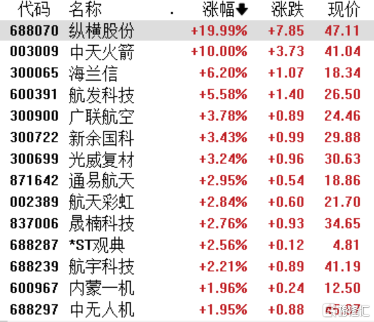 军工装备板块普涨,纵横股份20cm涨停,中天火箭10cm涨停,航发科技涨5.58%,广联航空、新余国科、光威复材涨超3%。