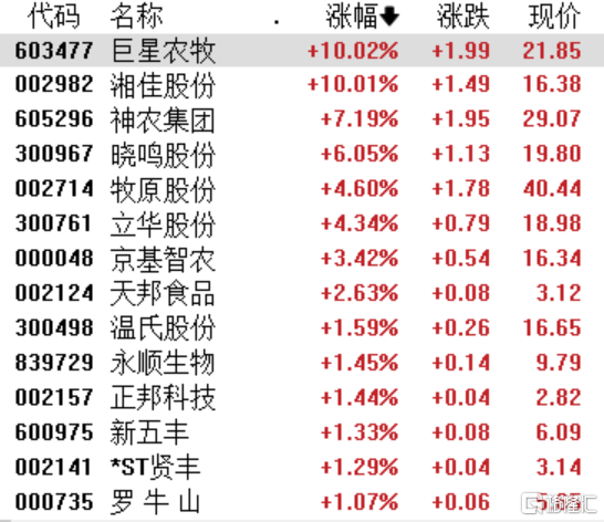 养殖业板块中,猪肉、鸡肉概念股集体拉升,巨星农牧、湘佳股份,神农集团涨超7%,晓鸣股份涨超6%,牧原股份、立华股份涨超4%,天邦食品、温氏股份、正邦科技跟涨。有市场消息称“生猪行业将不增母猪、育肥猪降体重到120KG、不鼓励卖二育”“还有消息显示,部分集团猪场已经于这两日发通知暂停二育销售”。对此,牧原股份工作人员表示,不太清楚,未听说相关消息。温氏股份工作人员则称,还没有关注到这个事情。