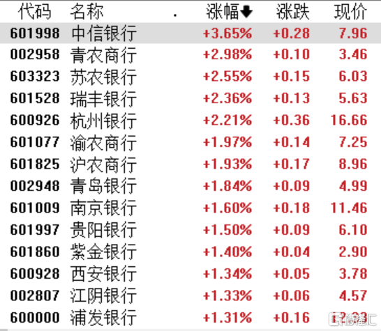 银行股逆势活跃,中信银行涨3.65%,青农商行、苏农银行、瑞丰银行、杭州银行涨超2%,渝农商行、青岛银行、南京银行涨超1%。