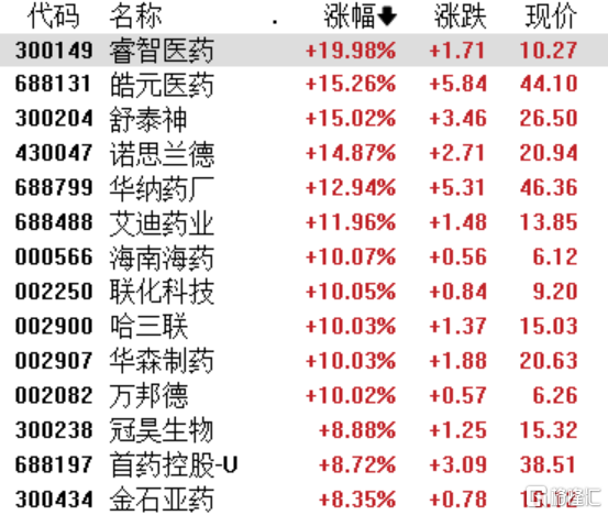 盘面上,医药股逆势走强,创新药方向领涨,哈三联等多股涨停;传闻称发改委号召稳产能稳猪价“不鼓励卖二育”,猪肉鸡肉概念拉升,巨星农牧、湘佳股份涨停;银行股、航天航空等板块涨幅居前。另一方面,可控核聚变板块回调,王子新材、融发核电双双跌停;机器人板块走低,德马科技跌超8%;电机、环保设备、消费电子等下跌。