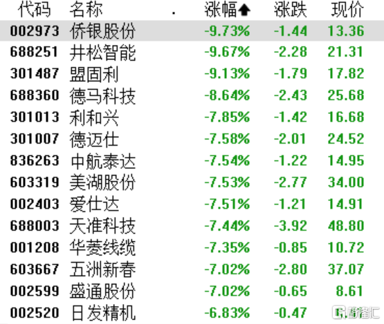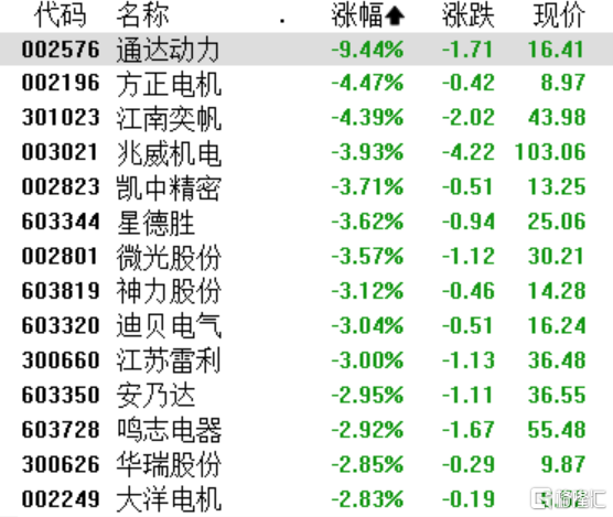 电机、发电机概念走弱,通达动力跌逾9%,方正电机(维权)、江南奕帆跌超4%,兆威机电、凯中精密、微光股份、神力股份跌超3%。
