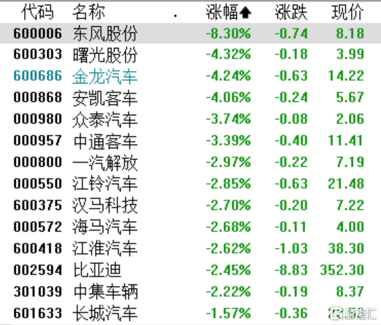 汽车整车概念下跌,东风股份跌8.3%,曙光股份、金龙汽车、安凯客车跌超4%,众泰汽车、中通客车、一汽解放纷纷下跌。