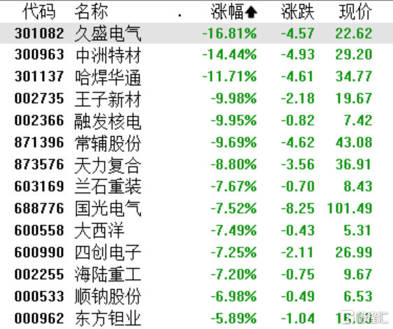 可控核聚变概念股跌幅居前,久盛电气跌超16%,中洲特材跌超14%,哈焊华通跌超11%,王子新材、融发核电跌停。