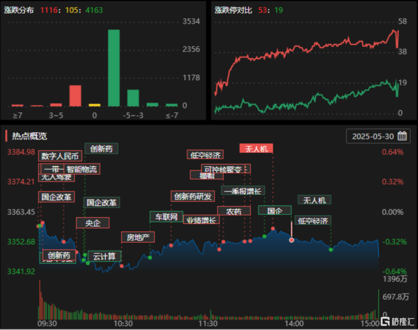 5月30日,A股三大指数震荡走低,创业板指领跌。截至收盘,沪指跌0.47%,深成指跌0.85%,创业板指跌0.96%,科创50跌0.94%,北证50指数跌0.51%。全市场成交额11642亿元,较上日缩量492亿元;超4100只个股飘绿。