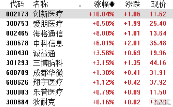 脑机接口概念股拉升,创新医疗涨停,爱朋医疗涨8.5%,诚益通、三博脑科涨超3%。消息面上,马斯克的脑机接口公司Neuralink在一轮融资中筹集了6亿美元,使公司的估值达到90亿美元。