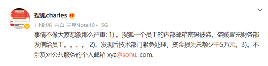5月25日午间,搜狐CEO张朝阳发微博回应称,事情不像大家想的那么严重。他表示,事件起因是搜狐一个员工的内部邮箱密码被盗,盗贼冒充财务部发信给员工。公司发现后,技术部门紧急处理,资金损失总额少于5万元。另外,此次发送诈骗邮件的不涉及对公共服务的个人邮箱 xyz@sohu.com.