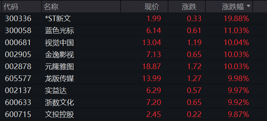 影视、知识产权类的个股集体大涨,截至收盘,视觉中国、龙版传媒、蓝色光标、金逸影视、文投控股等涨停或涨超10%,上海电影涨近9%,幸福蓝海涨约8%,光线传媒涨近7%。