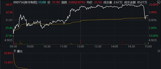 近日的大牛股新华制药今日盘中上演“高台跳水”,盘中一度涨停,最高至34.11元,再创历史新高,随后快速回落,但尾盘又小幅拉升。截至收盘,该股报31.9元上涨2.87%。