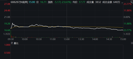 北交所“转板第一股”观典防务今日登陆科创板,开盘报17.5元下跌20%,尾盘再度回落。截至收盘,该股下跌23.63%报16.71元,换手率约23%,最新市值40亿元。