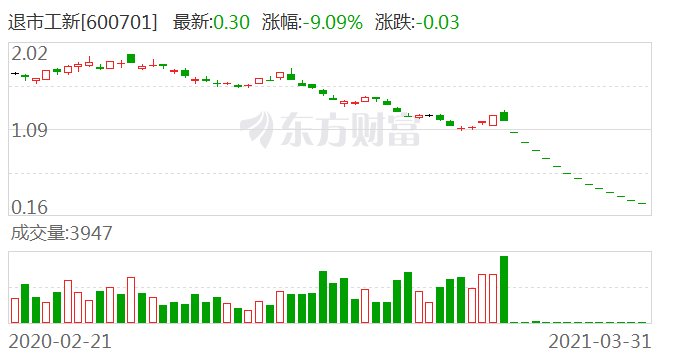 退市工新(SH 600701,收盘价:0.3元)3月31日下午发布公告称,公司股票交易于2021年3月30日、2021年3月31日连续两个交易日内日收盘价格跌幅偏离值累计达到20%。公司于2021年3月5日收到上交所《关于哈尔滨工大高新技术产业开发股份有限公司股票终止上市的决定》,上交所决定终止公司股票上市。除上述已披露事项外,公司不存在关于本公司的应披露而未披露的重大事项或重要信息。