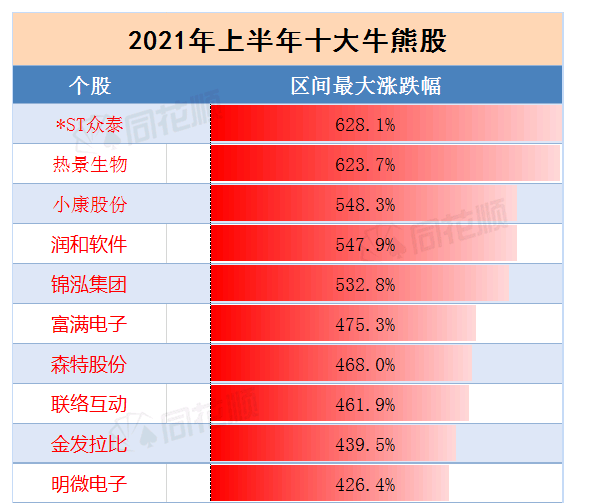 随着6月最后一个交易日的结束,各种“十大牛股”迅速火遍全网。数据显示,上半年两市有2093只个股上涨,136只个股涨幅超过100%,26只个股涨幅超过200%。剔除年内上市的新股,上半年十大牛股分别为*st众泰、明微电子、热景生物、锦泓集团、森特股份、润和软件、富满电子、小康股份、岩石股份(维权)、联络互动(维权)。
