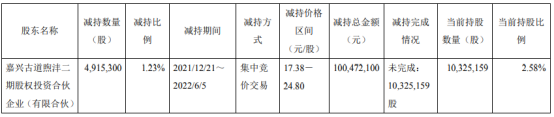 公告显示,减持前古道煦沣二期合计持有公司股份15,240,459股,占公司普通股总股本3.81%,本次减持后持有股份10,325,159股,占公司普通股总股本比例为2.58%。