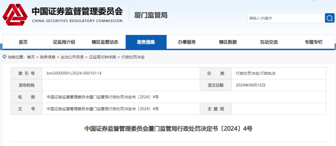 厦门证监局〔2024〕4号《行政处罚决定书》显示: