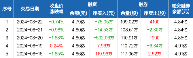 融资方面,当日融资买入134.82万元,融资偿还210.78万元,融资净偿还75.95万元,连续3日净偿还累计682.54万元。融券方面,融券卖出1.85万股,融券偿还1.44万股,融券余量109.02万股,融券余额439.37万元。融资融券余额合计4.84亿元。