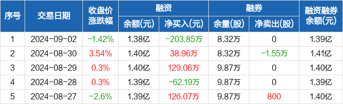 融资方面,当日融资买入137.09万元,融资偿还340.94万元,融资净偿还203.85万元。融券方面,融券卖出0股,融券偿还0股,融券余量8.32万股,融券余额28.79万元。融资融券余额合计1.39亿元。