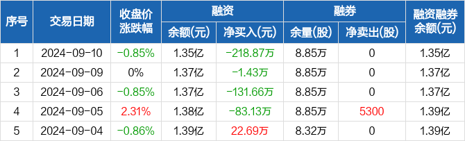 融资方面,当日融资买入128.84万元,融资偿还347.71万元,融资净偿还218.87万元,连续4日净偿还累计435.09万元。融券方面,融券卖出0股,融券偿还0股,融券余量8.85万股,融券余额30.8万元。融资融券余额合计1.35亿元。