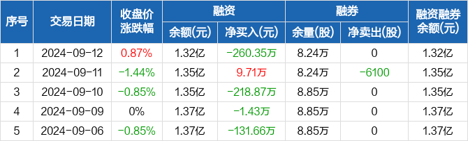 融资方面,当日融资买入172.67万元,融资偿还433.02万元,融资净偿还260.35万元。融券方面,融券卖出0股,融券偿还0股,融券余量8.24万股,融券余额28.51万元。融资融券余额合计1.32亿元。