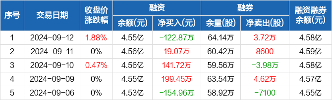 国网英大(维权)融资融券信息显示,2024年9月12日融资净偿还122.87万元;融资余额4.55亿元,较前一日下降0.27%