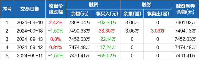 融资方面,当日融资买入134.73万元,融资偿还227.02万元,融资净偿还92.3万元。融券方面,融券卖出0股,融券偿还0股,融券余量3.06万股,融券余额3.89万元。融资融券余额合计7401.92万元。