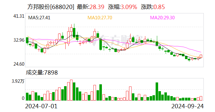 2024年9月24日,方邦股份发生了1笔大宗交易,总成交22.5万股,成交金额724.5万元,成交价32.20元。当日收盘报价28.39元,涨幅3.09%,成交金额2215.61万元;大宗交易成交金额占当日成交金额32.70%,溢价13.42%。