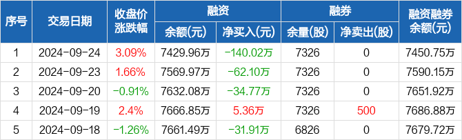 融资方面,当日融资买入257.95万元,融资偿还397.97万元,融资净偿还140.02万元,连续3日净偿还累计236.89万元。融券方面,融券卖出0股,融券偿还0股,融券余量7326股,融券余额20.8万元。融资融券余额合计7450.75万元。