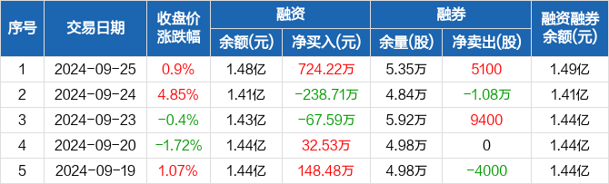 融资方面,当日融资买入1267.04万元,融资偿还542.82万元,融资净买入724.22万元。融券方面,融券卖出5100股,融券偿还0股,融券余量5.35万股,融券余额41.99万元。融资融券余额合计1.49亿元。