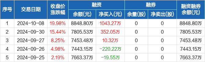 融资方面,当日融资买入2749.14万元,融资偿还1705.87万元,融资净买入1043.27万元,连续3日净买入累计1405.65万元。融券方面,融券卖出0股,融券偿还0股,融券余量0股,融券余额0元。融资融券余额合计8848.8万元。