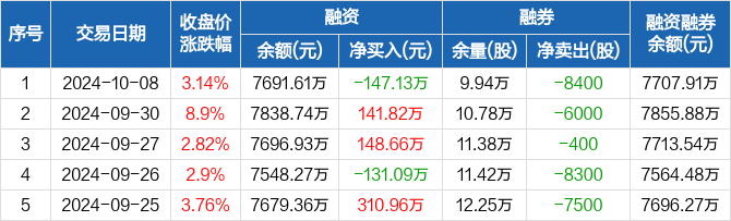 融资方面,当日融资买入932.35万元,融资偿还1079.48万元,融资净偿还147.13万元。融券方面,融券卖出0股,融券偿还8400股,融券余量9.94万股,融券余额16.3万元。融资融券余额合计7707.91万元。