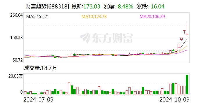 上交所2024年10月9日交易公开信息显示,财富趋势因属于有价格涨跌幅限制的日价格振幅达到30%的前五只证券而登上龙虎榜。财富趋势当日报收173.03元,涨跌幅为-8.48%,换手率10.20%,振幅29.14%,成交额34.86亿元。