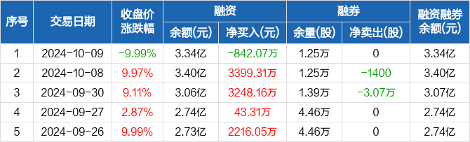 融资方面,当日融资买入6112.03万元,融资偿还6954.1万元,融资净偿还842.07万元。融券方面,融券卖出0股,融券偿还0股,融券余量1.25万股,融券余额14.53万元。融资融券余额合计3.34亿元。