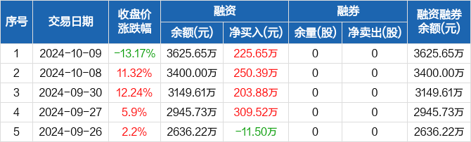 融资方面,当日融资买入1157.19万元,融资偿还931.54万元,融资净买入225.65万元,连续4日净买入累计989.44万元。融券方面,融券卖出0股,融券偿还0股,融券余量0股,融券余额0元。融资融券余额合计3625.65万元。