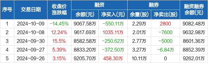 融资方面,当日融资买入1755.57万元,融资偿还2305.68万元,融资净偿还550.11万元。融券方面,融券卖出3100股,融券偿还300股,融券余量2.29万股,融券余额14.91万元。融资融券余额合计9082.48万元。