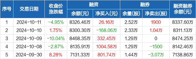 融资方面,当日融资买入1145.58万元,融资偿还1119.42万元,融资净买入26.16万元。融券方面,融券卖出1900股,融券偿还0股,融券余量2.52万股,融券余额11.14万元。融资融券余额合计8337.6万元。