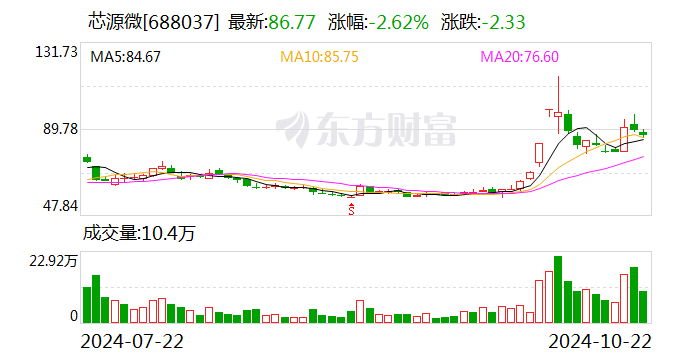 二级市场上,截至10月22日收盘,芯源微股价跌2.62%,报86.77元/股,目前总市值174.29亿元。