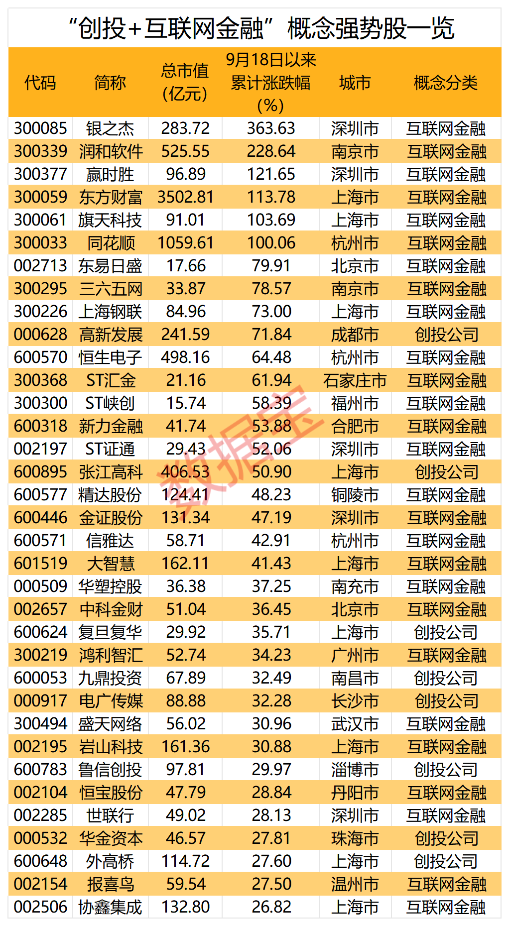 从涨幅来看,自9月18日以来,平均涨幅超46%,其中涨幅最大的是银之杰、润和软件和赢时胜。
