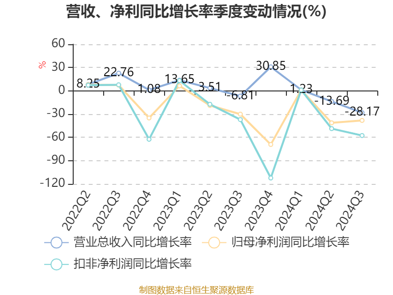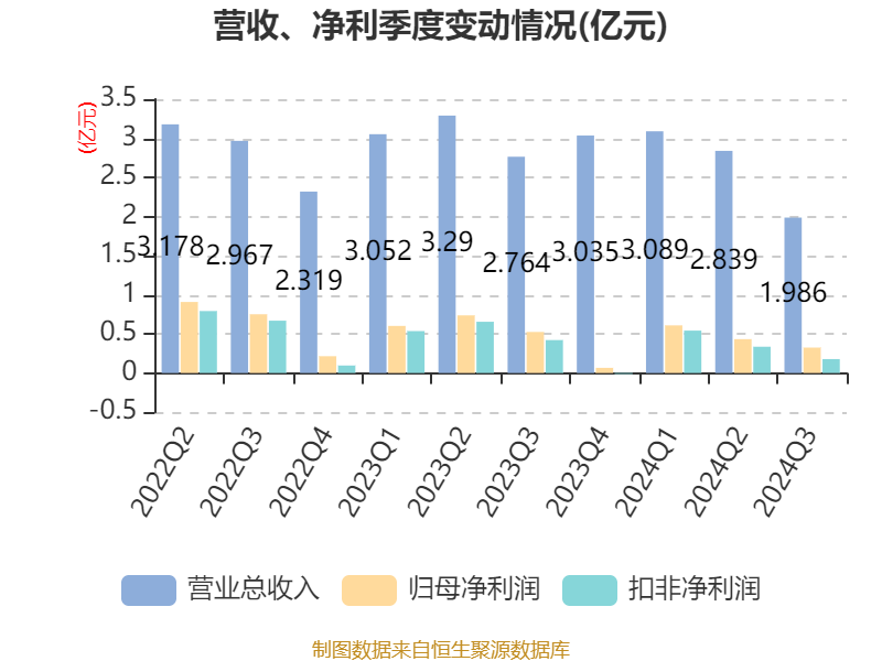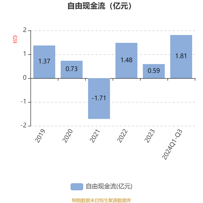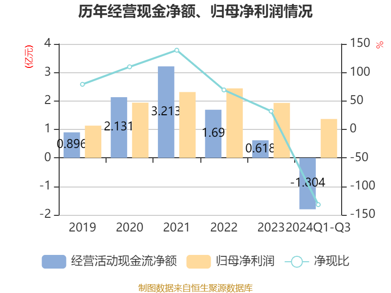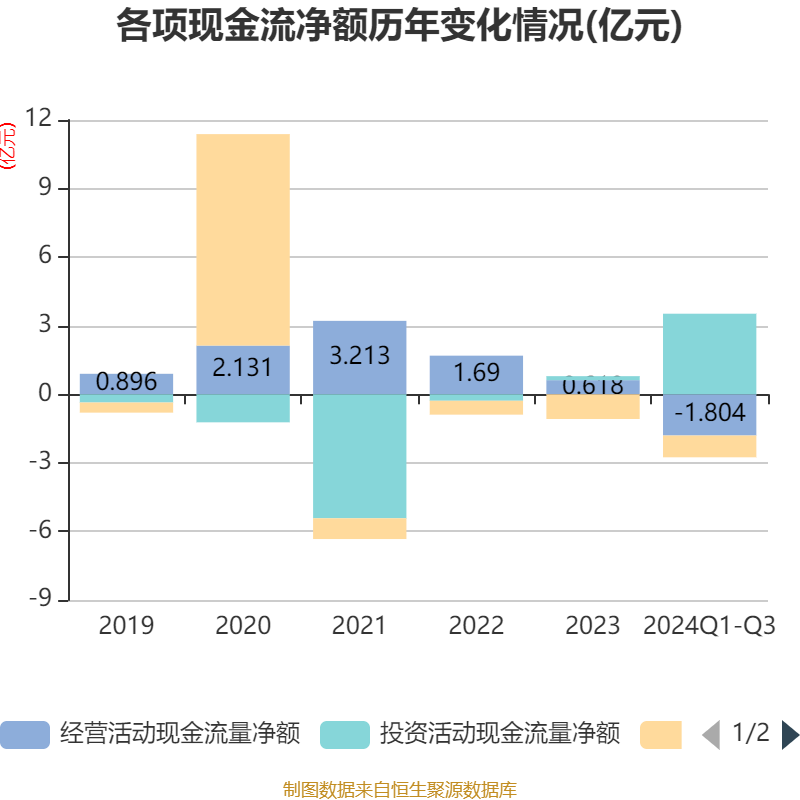 2024年前三季度,公司经营活动现金流净额为-1.8亿元,同比减少3603.82万元;筹资活动现金流净额-9531.45万元,同比增加1217.54万元;投资活动现金流净额3.53亿元,上年同期为2636.16万元。