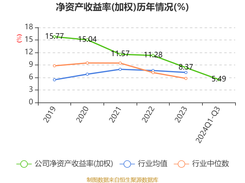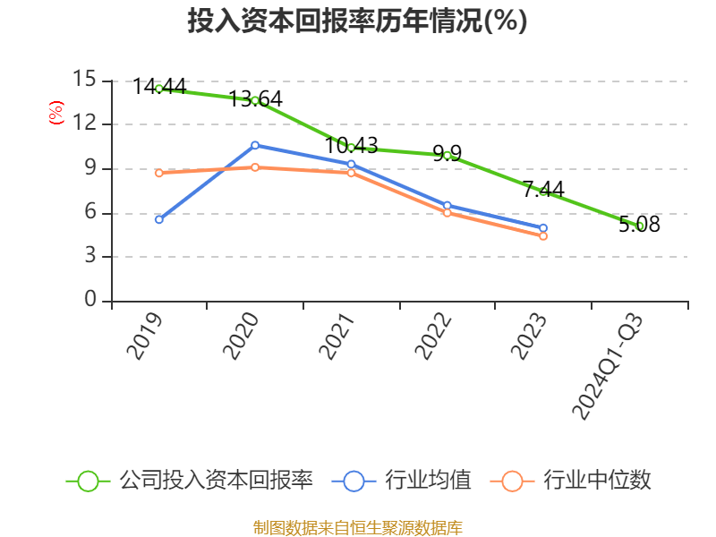 盈利能力方面, 2024年前三季度公司加权平均净资产收益率为5.49%,同比下降2.29个百分点。公司2024年前三季度投入资本回报率为5.08%,较上年同期下降2.19个百分点。