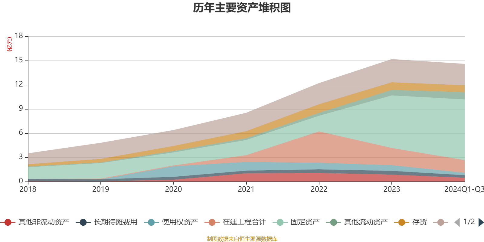 资产重大变化方面,截至2024年三季度末,公司固定资产较上年末增加15.21%,占公司总资产比重上升6.55个百分点;在建工程合计较上年末减少26.27%,占公司总资产比重下降3.37个百分点;使用权资产较上年末减少56.18%,占公司总资产比重下降2.46个百分点;其他非流动资产较上年末减少45.21%,占公司总资产比重下降2.37个百分点。