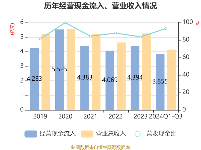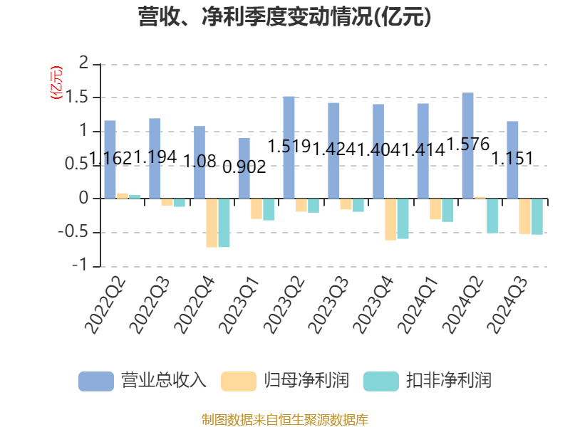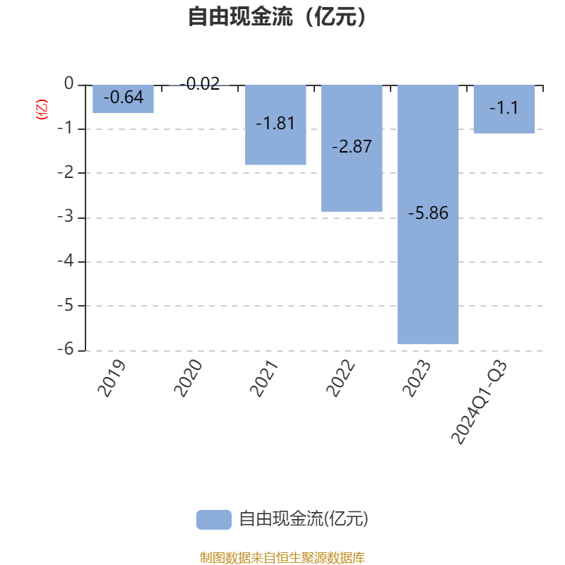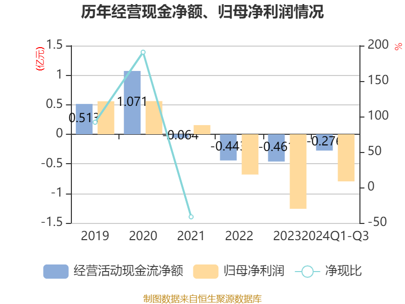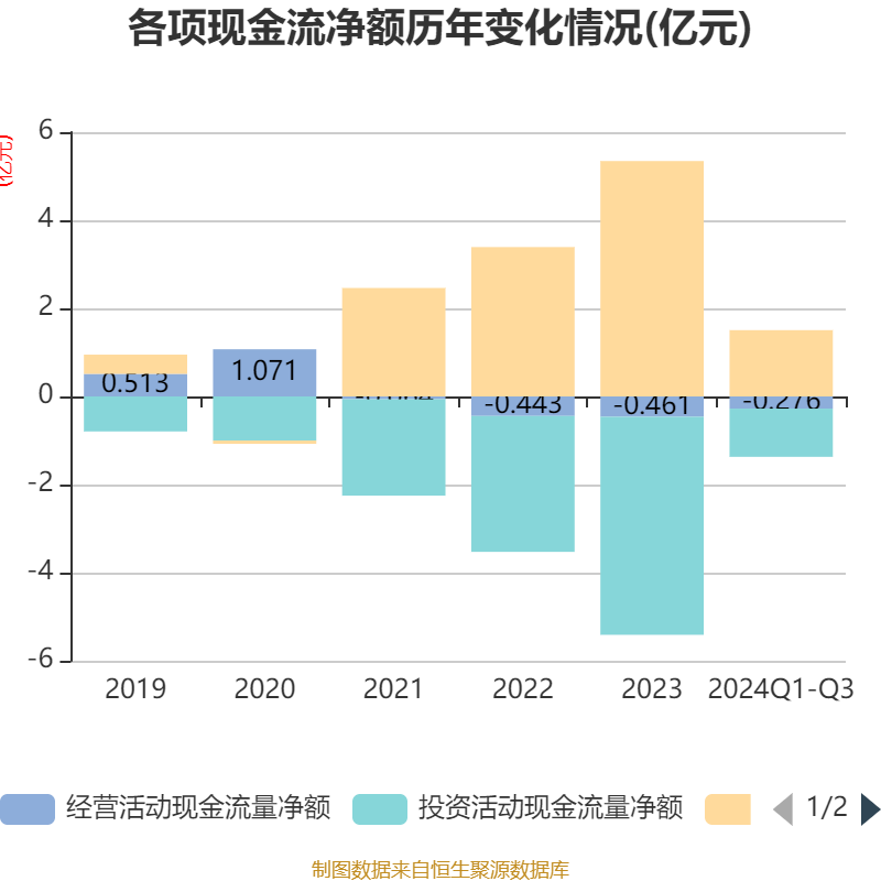 2024年前三季度,公司经营活动现金流净额为-2757.18万元,同比增加2408.64万元;筹资活动现金流净额1.5亿元,同比减少3.35亿元;投资活动现金流净额-1.1亿元,上年同期为-3.95亿元。