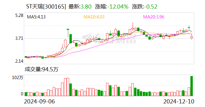 ST天瑞被处罚后,股价风险骤然加大。2024年4月公司被立案调查时,股价就曾大跌。例如4月26日,天瑞仪器报收于3.46元,股价大跌6.23%。此次被实施其他风险警示,公司股票自2024年12月9日开市起停牌一天,更是引发了市场的担忧,12月10日复牌后,ST天瑞跳空低开,截至上午收盘报3.80元/股,下跌12.04%,市值降至19亿元以下。对于投资者来说,这无疑是一个重大打击。天瑞仪器需要认真反思自身问题,采取有效措施加强内部治理,提高信息披露质量,努力提升业绩,以恢复市场对公司的信心。