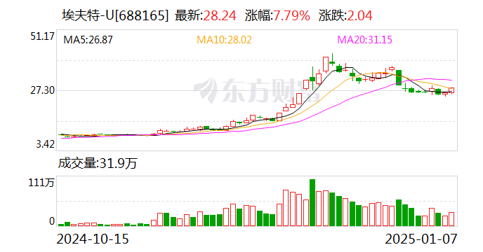 证券时报·数据宝统计显示,埃夫特今日收盘价为28.24元,上涨7.79%,日换手率为6.11%,成交额为8.65亿元,全天主力资金净流入5727.63万元,近5日该股累计上涨7.34%,近5日资金合计净流入815.41万元。